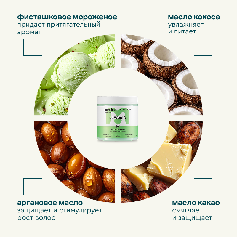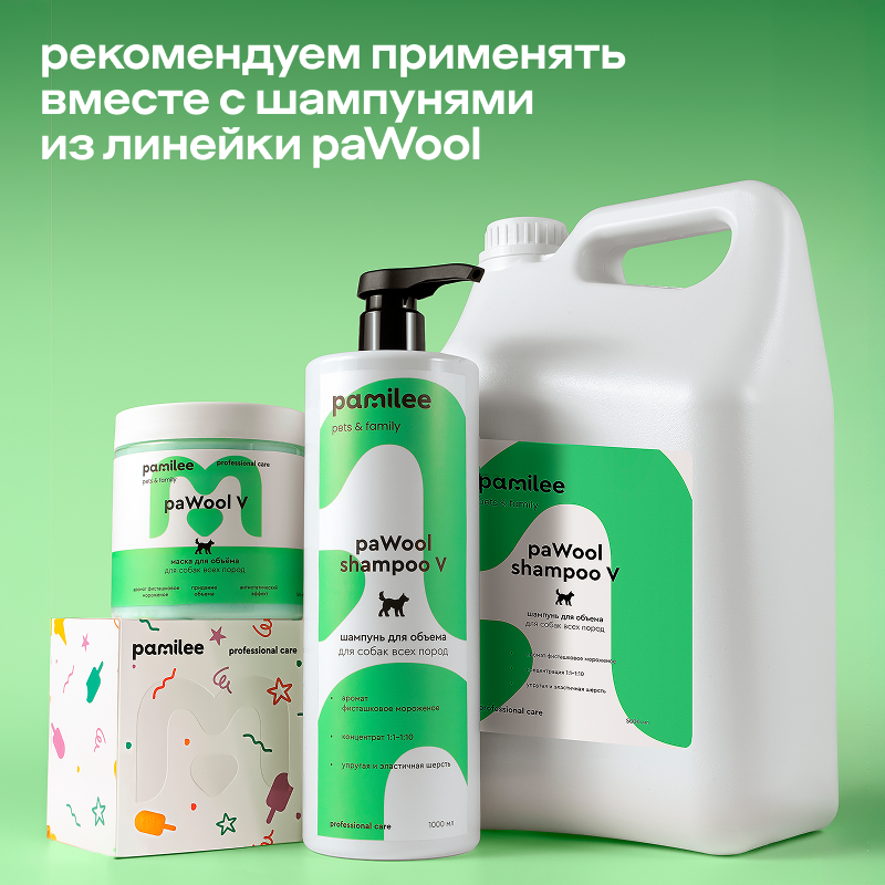 Профессиональная маска-концентрат для груминга придает пышный объем и сглаживает чешуйки, поднимая волос от самых корней. После применения шерсть становится густой и шелковистой, без утяжеления. Если вам нужно добиться воздушности и легкости, то это ваш вариант. Средство дает моментальный эффект даже на редком и тонком волосе. Ну а запах фисташкового мороженого — просто объедение!